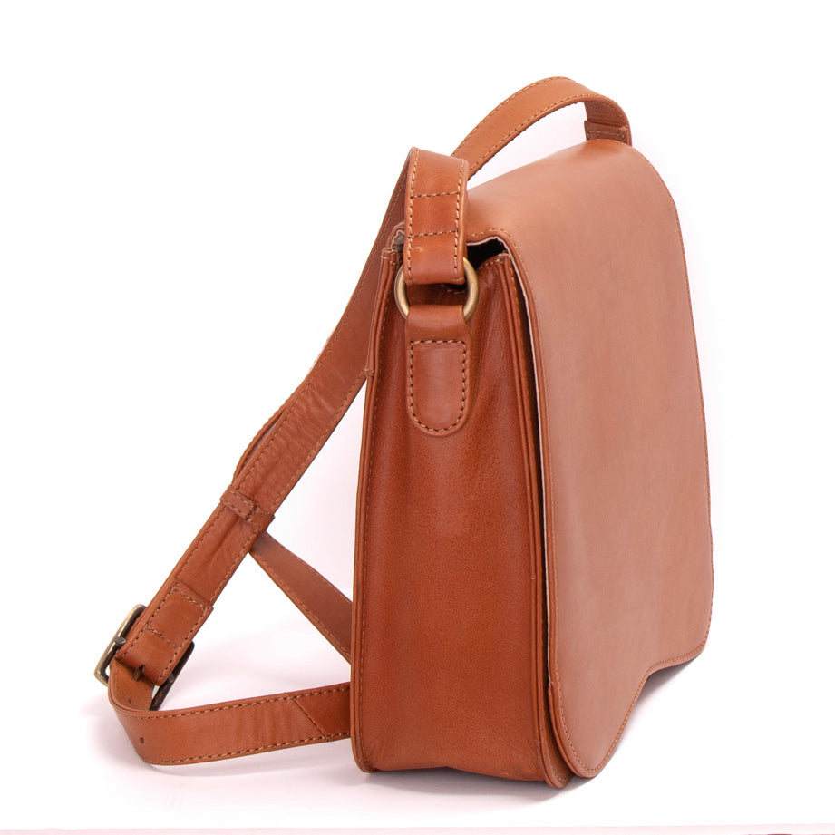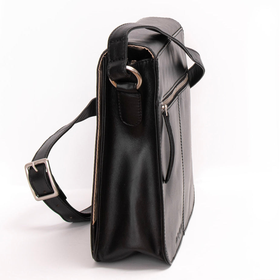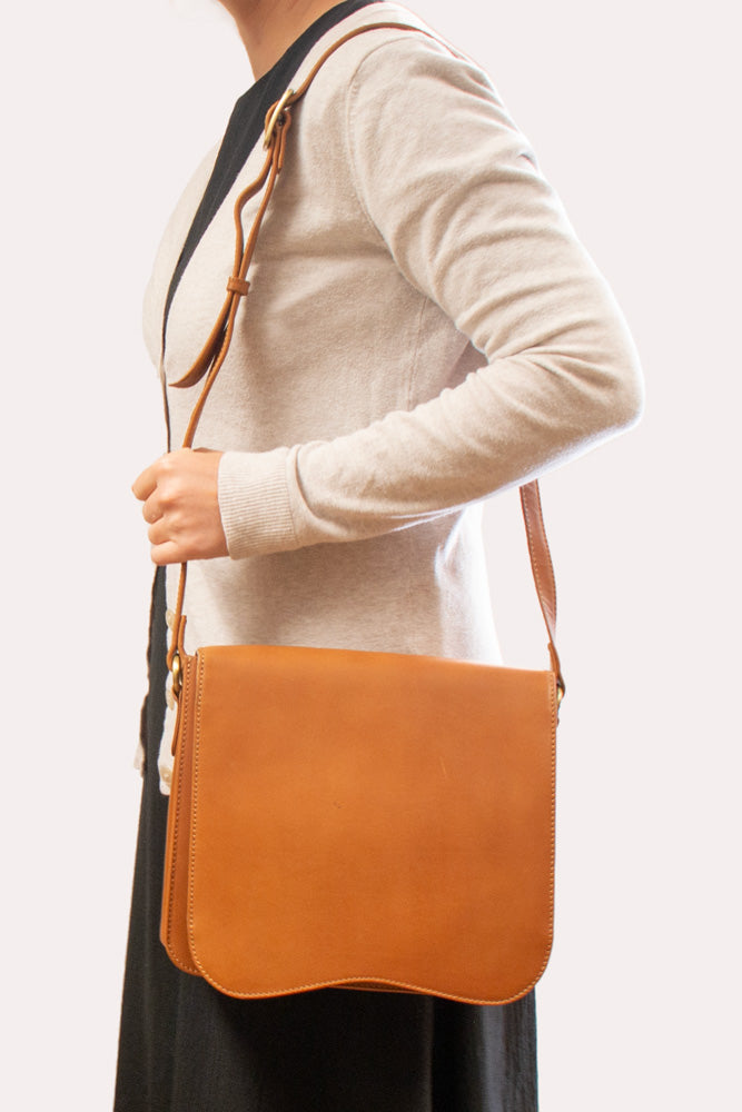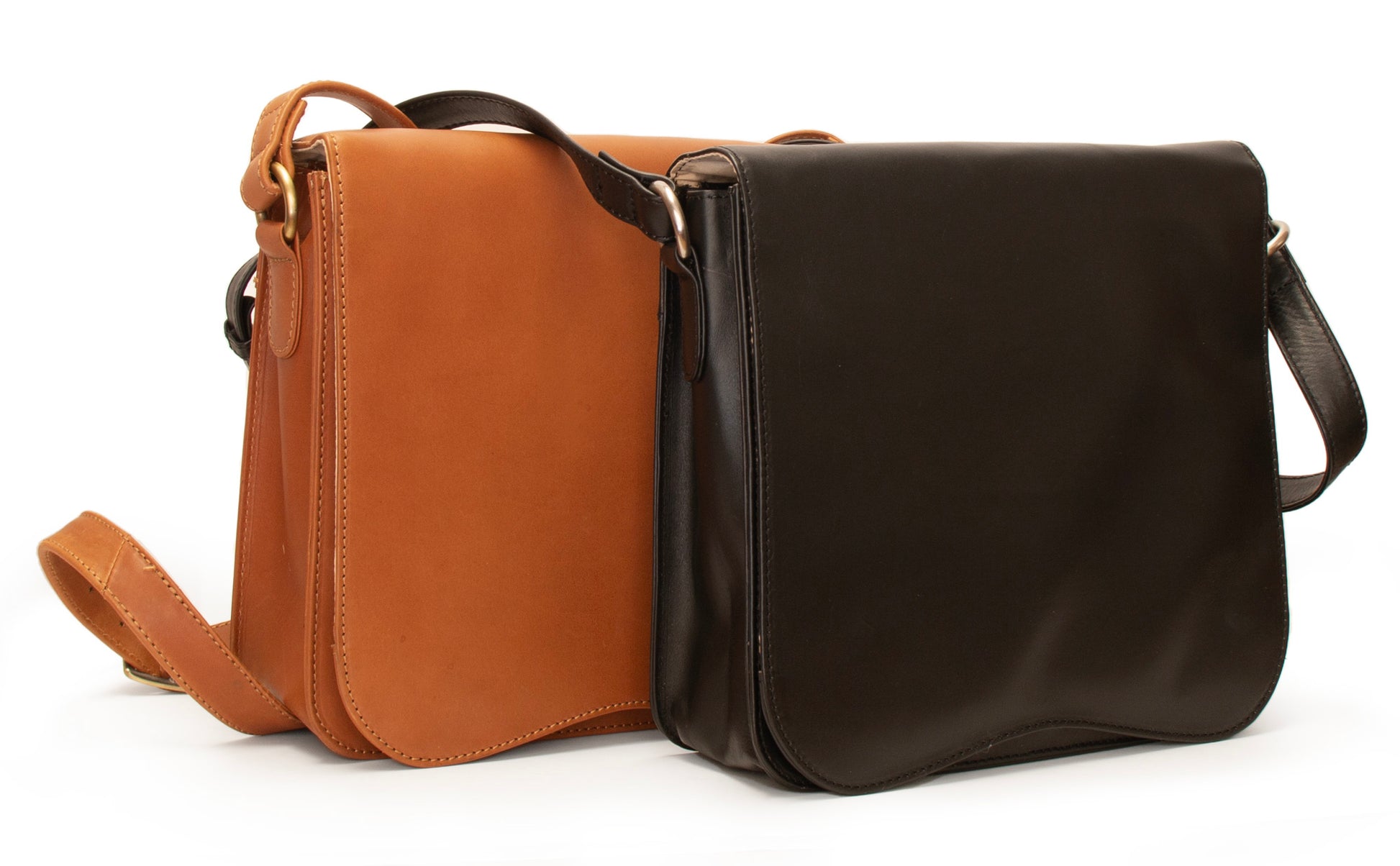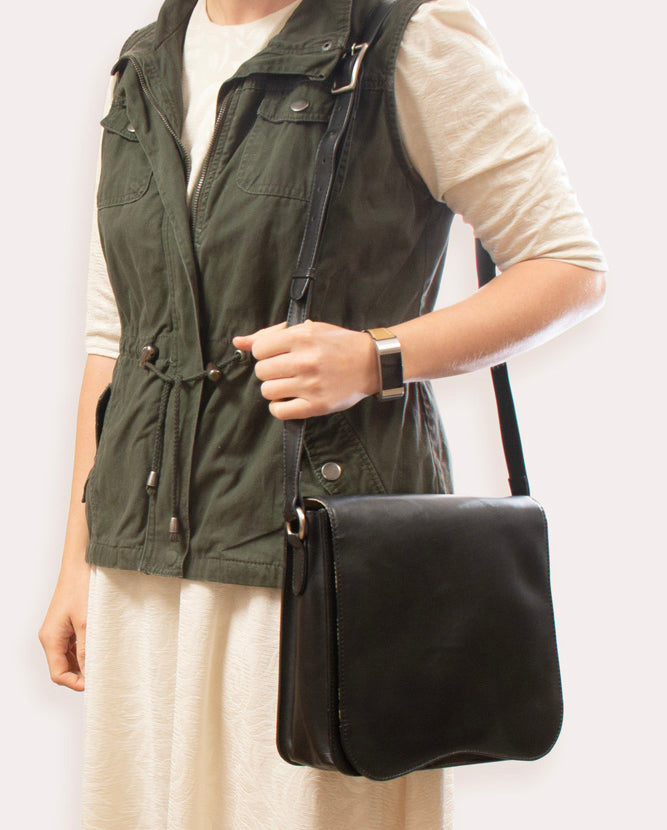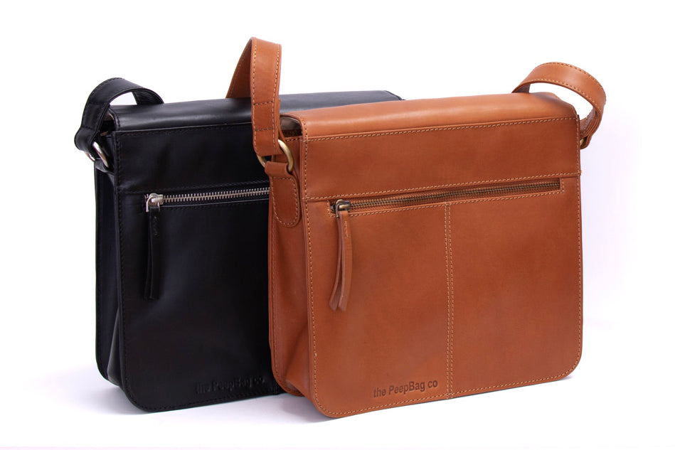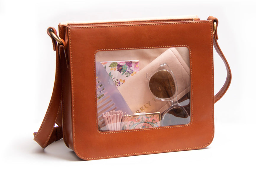 A unique purse that hides a vinyl window under a leather flap, so that you can see everything in your purse! This is a crossbody purse made of top-grain leather with hardware of brass on the sable and nickel on the black.